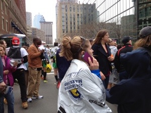 Diane’s mom had snapped this eerie picture of she and I talking when the first explosion went off. Notice everyone turned in the direction of the noise. Unreal, sad, and heartbroken. Is nothing sacred. And so senseless.